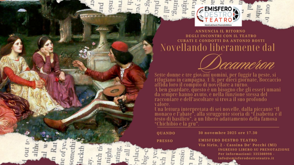 Porteremo in scena una lettura interpretata di sei novelle, dalla piccante “Il monaco e l’abate“, alla struggente storia di “Lisabetta e il testo di basilico“, a un libero adattamento della famosa “Chichibio e la gru“.